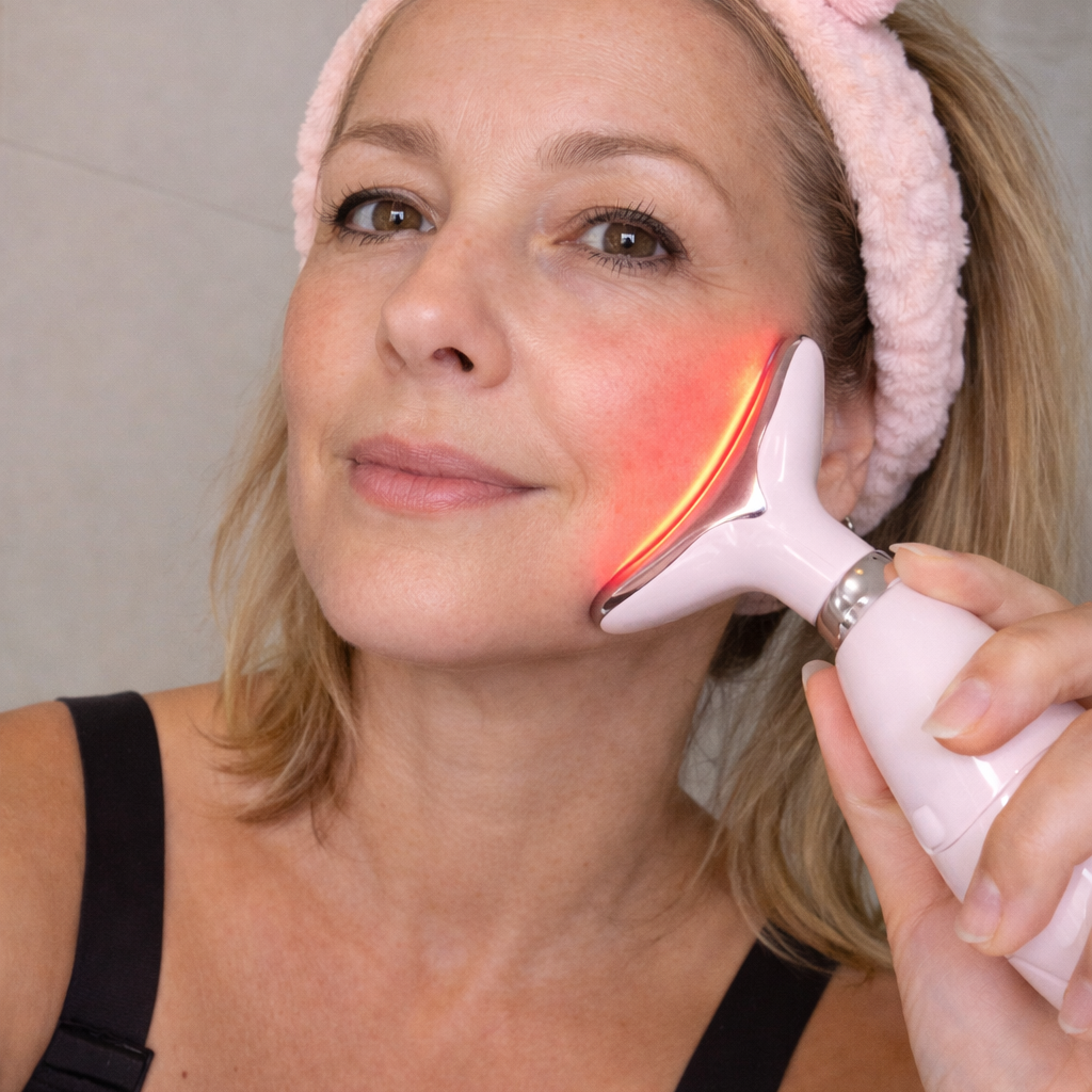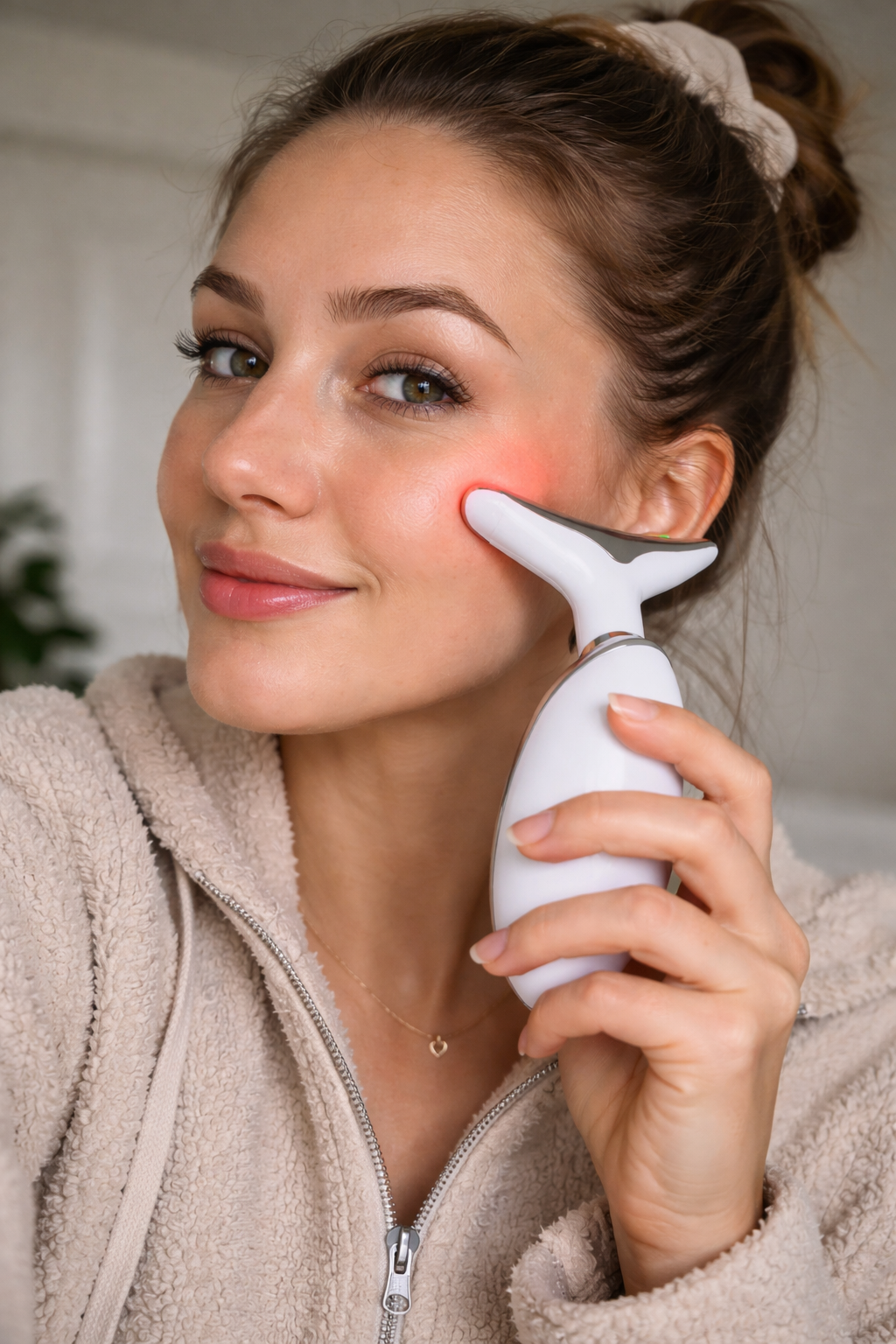 El masajeador combina calor y tecnología EMS para activar la circulación en el rostro, ayudando a que la piel absorba mejor los nutrientes y se vea más saludable.